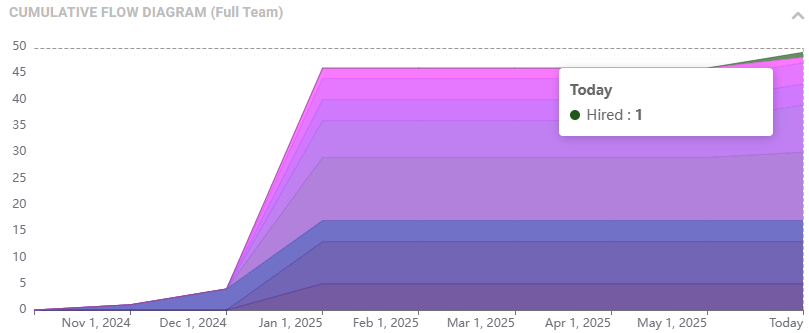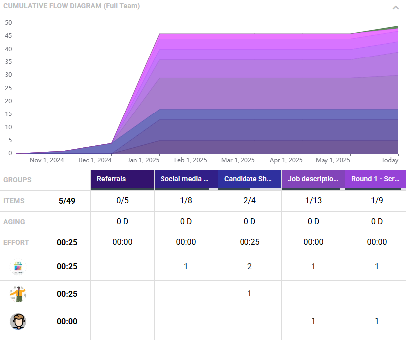 Board dashboards now include a Cumulative Flow Diagram (CFD) to visualize how work progresses across Item Groups over time. The diagram is interactive, with color-coded groups, hover tooltips, and a collapsible layout, so managers can quickly spot bottlenecks, understand throughput, and review progress without leaving the Board.