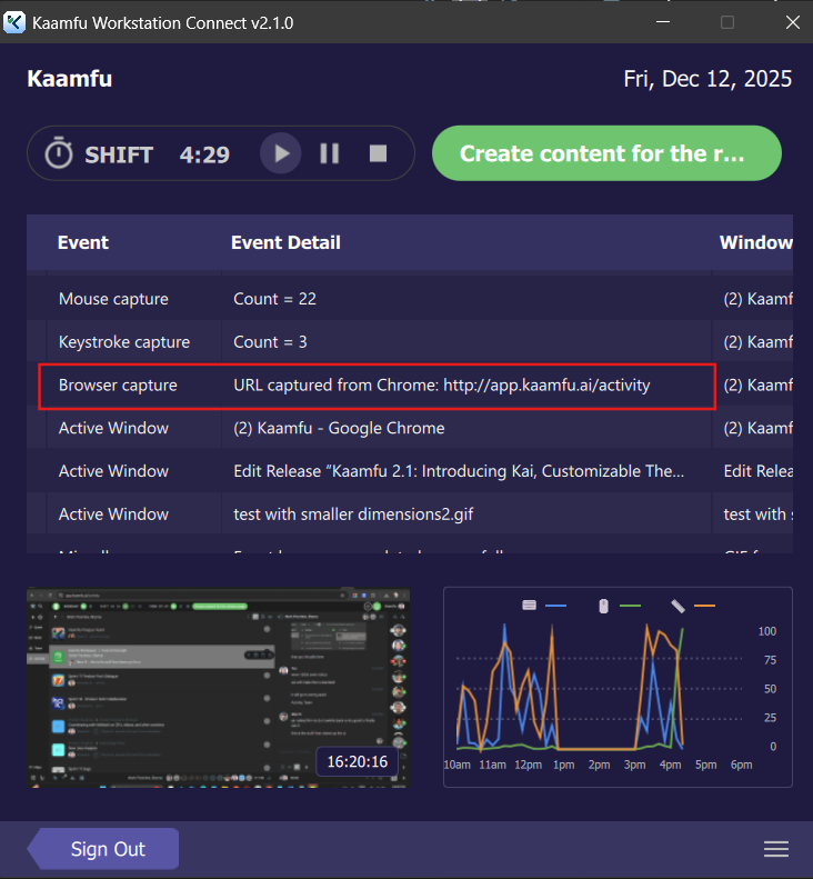 Kaamfu Workstation Connect now captures the URL when a worker is active in a browser. The event appears as Browser Capture, and the details show which browser was used along with the captured URL.