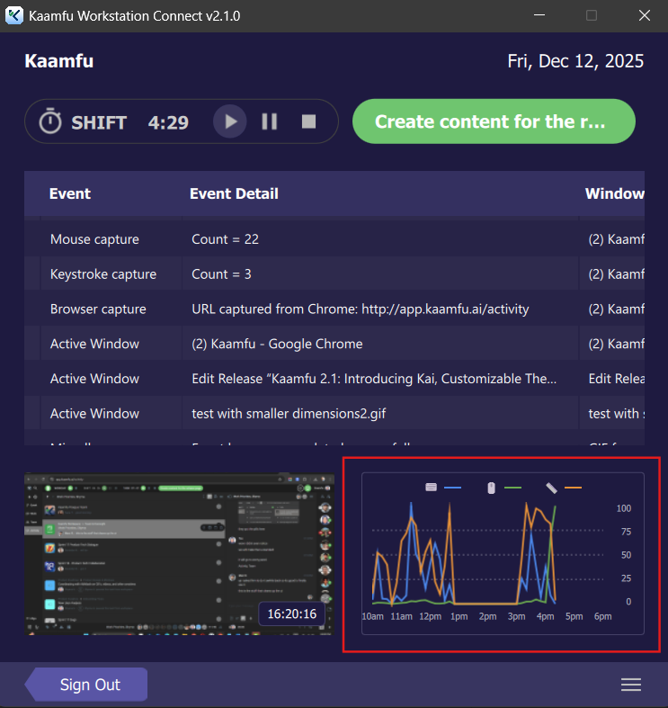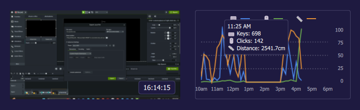 Workstation Connect now includes a live activity graph alongside the event table. The graph visualizes activity over time, with time on the horizontal axis and activity counts on the vertical axis. When you hover over the graph, a tooltip follows your cursor and shows the timestamp, keystroke count, mouse click count, and mouse travel distance—making activity patterns easier to read at a glance.