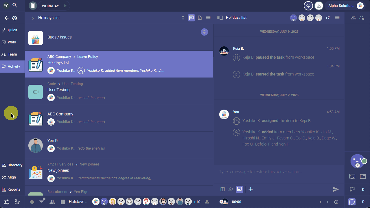 Try it by right-clicking a member’s Avatar from the Workline/status panel on the right sidebar, inside a conversation, or from the Team panel. The Story View opens in the extended pane, where you can scroll through each section to review the past hour.