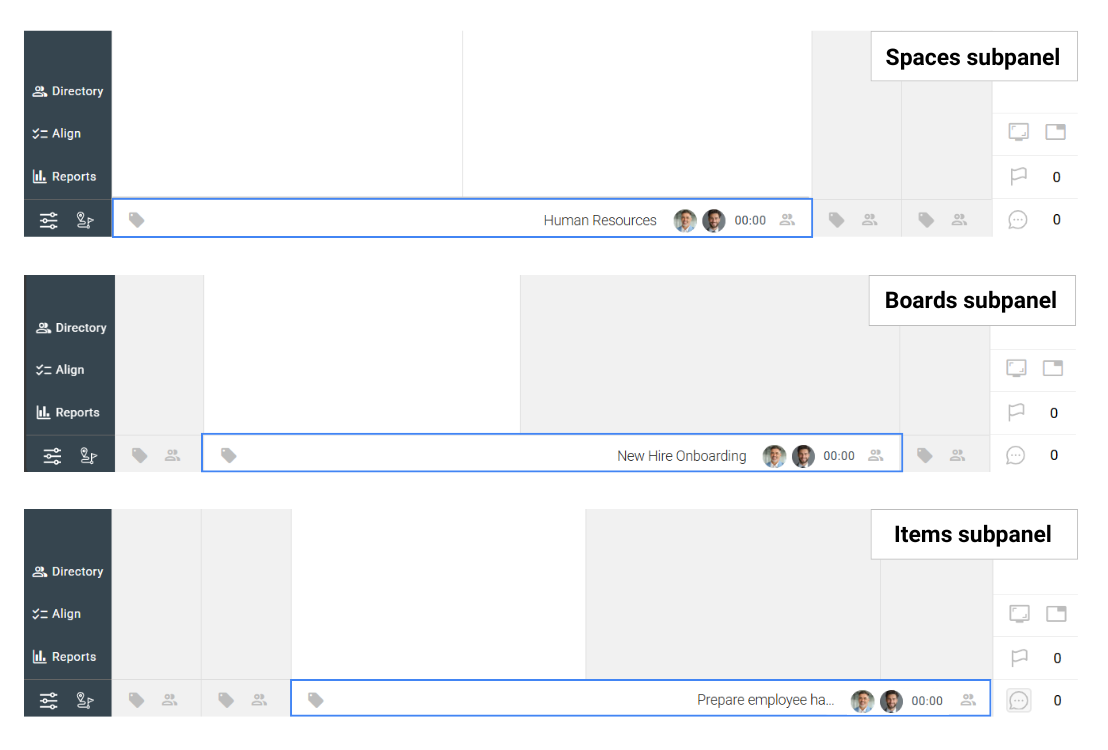 These functions remain consistent across Spaces, Boards, and Items, with only slight variations in the Items subpanel.