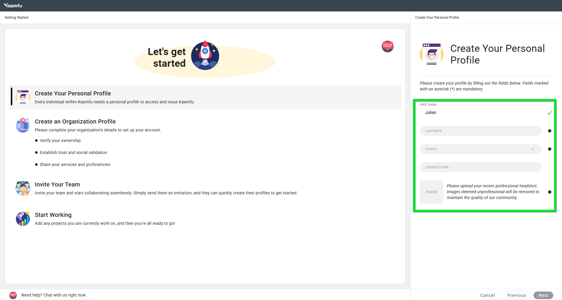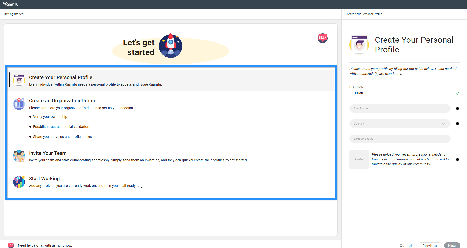Signing up as an Owner on Kaamfu allows you to create a new organization, set up profiles, invite team members, and begin using your workspace. This guide walks you through the process step by step.