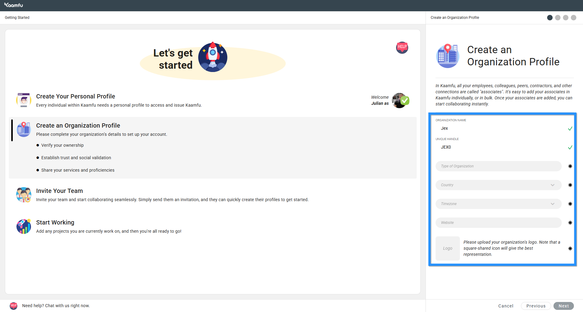 - “Organization Name” and “Unique Handle” are prefilled (from Step 3). Update if required