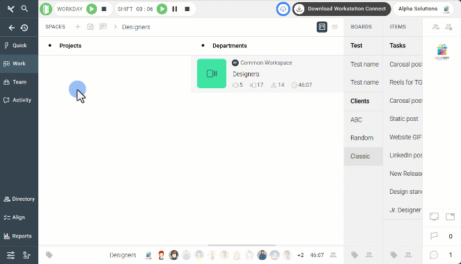 Click a Space to populate its Boards in the middle column, then click a Board to populate Items in the right column. Use single clicks to move around with full context.