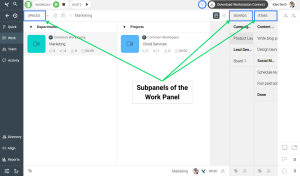 The Spaces sub-panel is the top level of the Work Panel. Spaces typically represent company departments such as Marketing, Sales, or Engineering.