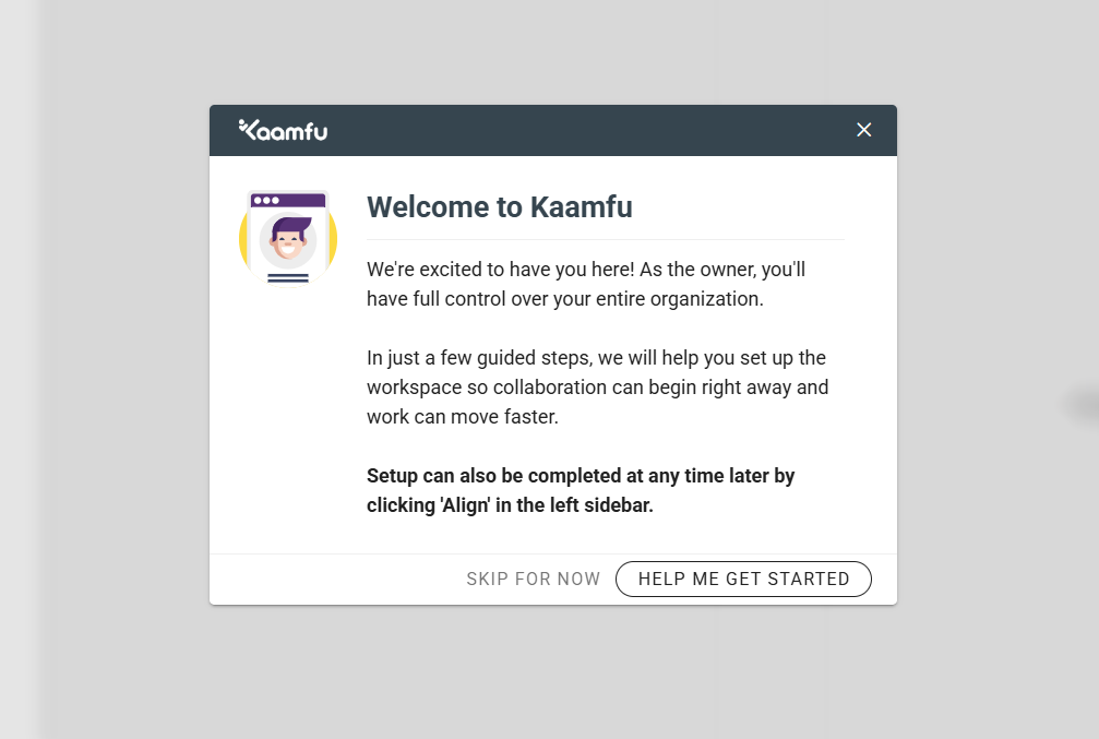• Launches the onboarding journey, which provides a guided walkthrough of Kaamfu.