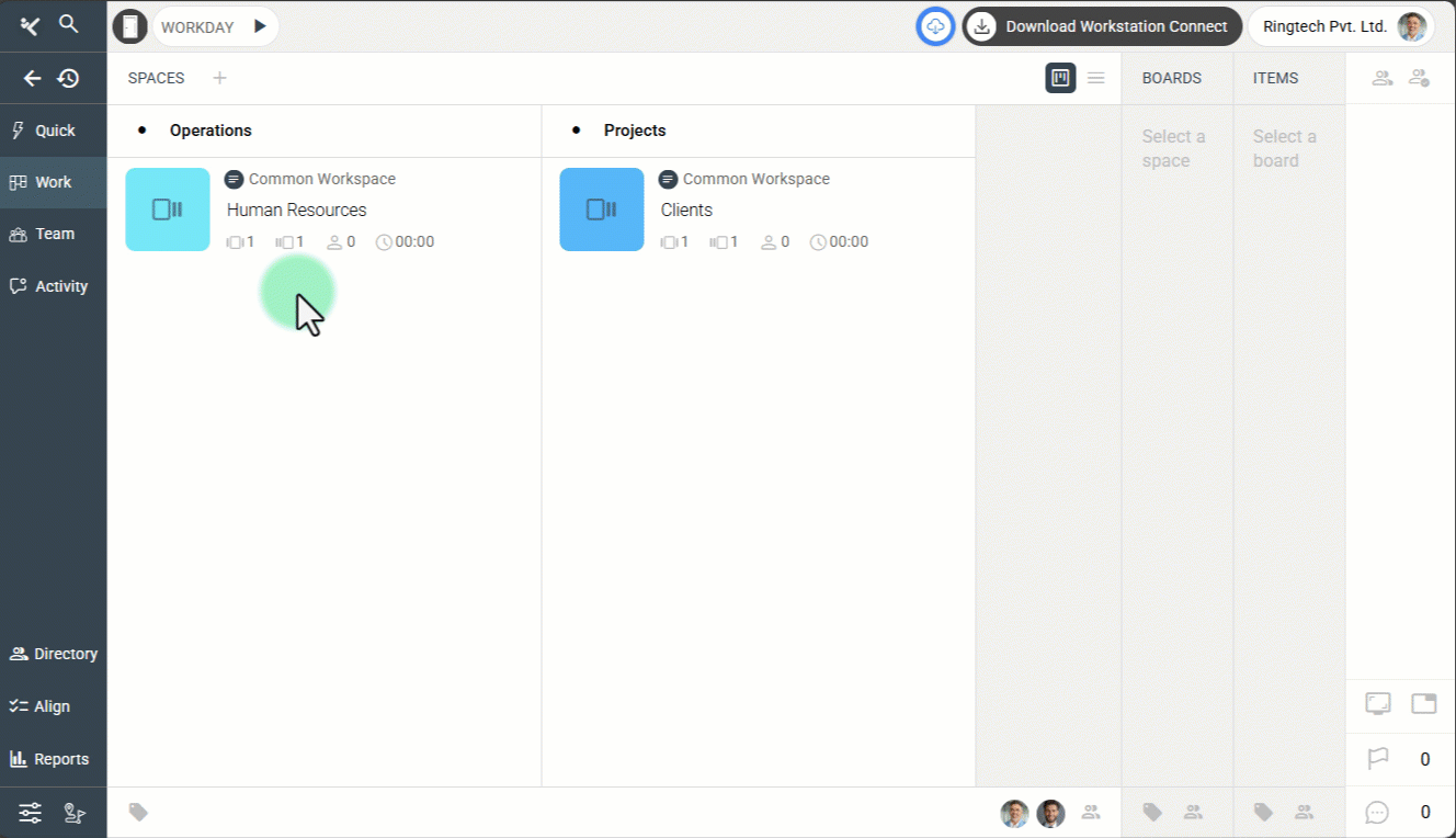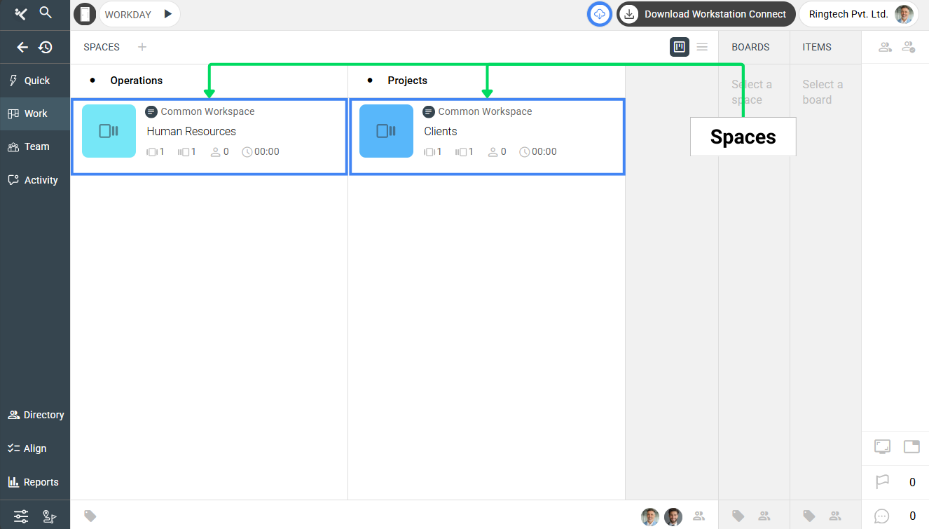 • Metrics row: Quick metrics—Boards, Items, Members, and Total Effort (cumulative time) for the Space.
