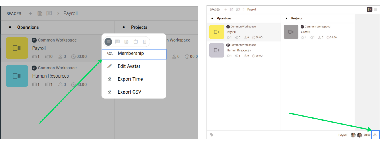 • Chin route: Click the Space → click the Membership icon in the chin of the Spaces subpanel.