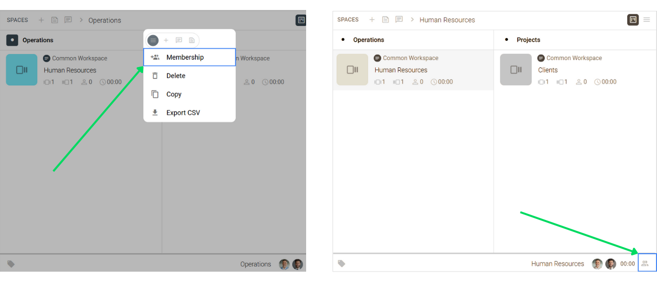 - Through the chin: With the Space Group selected, click the Membership icon in the chin of the Spaces subpanel.