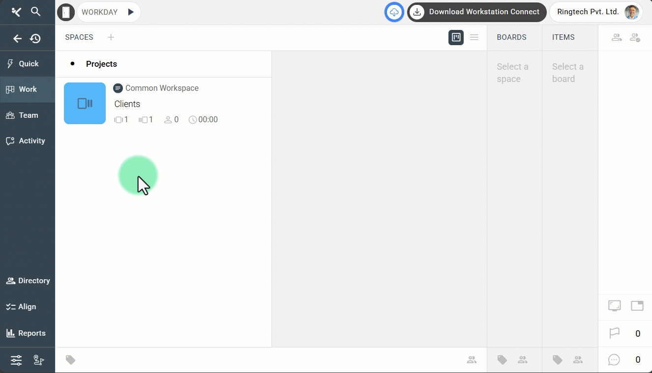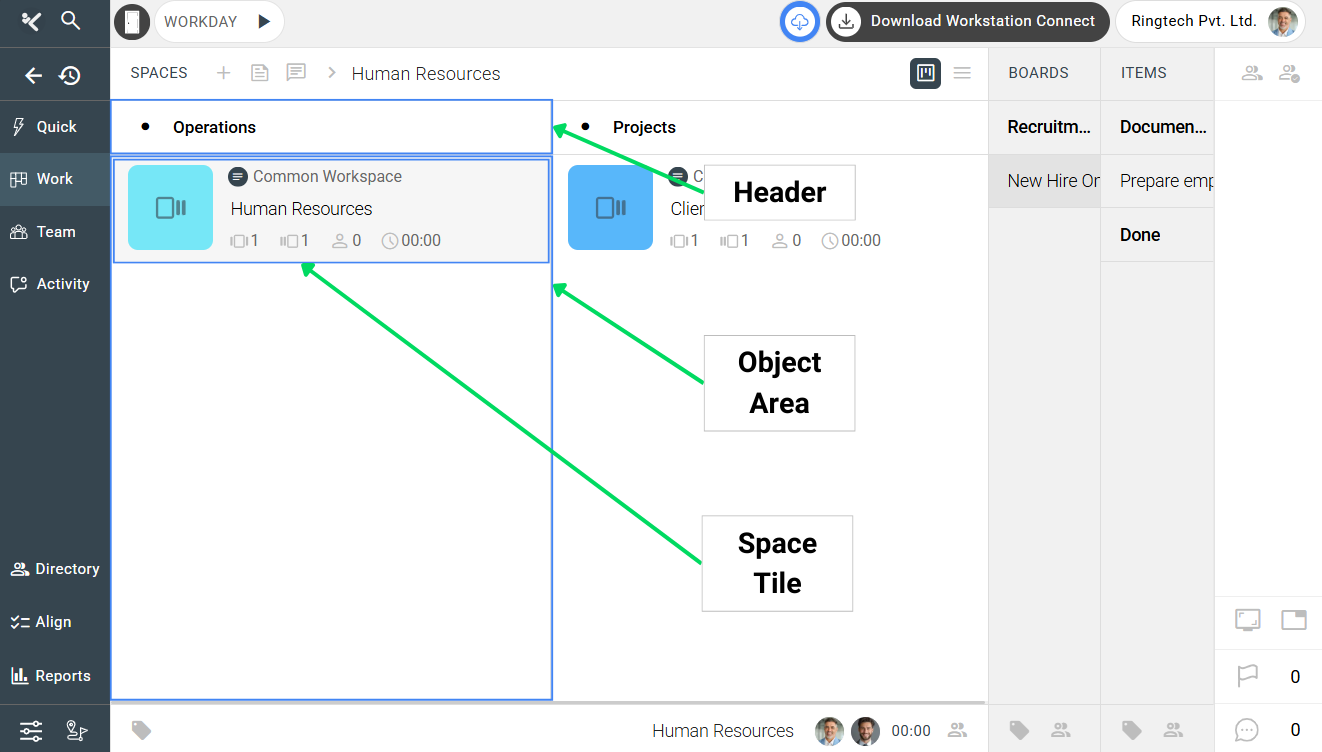 - Object area: Holds the Spaces created inside it, which then cascade into Boards, Item Groups, and Items.
