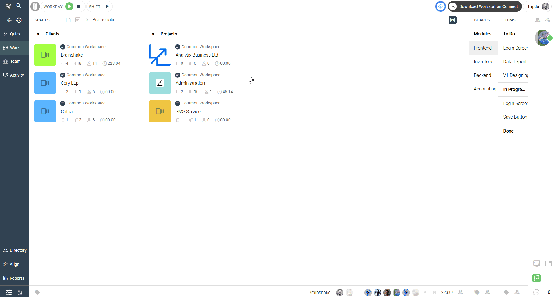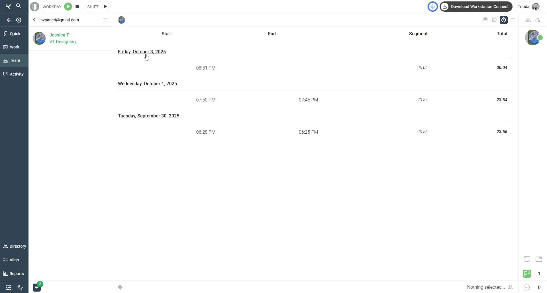 - Clicking on a date opens the detailed workday view in the right panel.